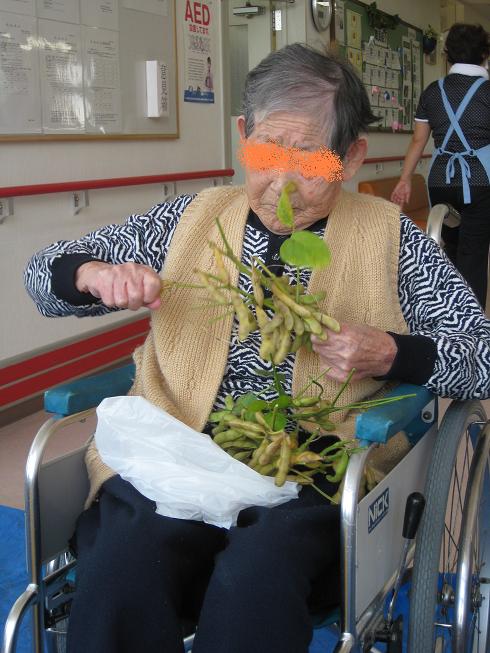 利用者さまの皆さんはとっても働き者なので「こっち!こっち!」と枝豆の