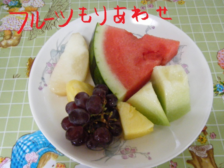 「のり巻き・いなり寿司・やきそば・お好み焼き・フランクフルト・から揚げ・焼き鳥・冷たいスープ(とうもろこし、じゃがいも)・園で採れたきゅうりの漬物」