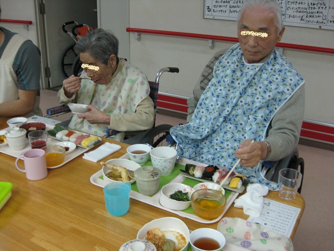 にぎり寿司・すまし汁・天ぷら・茶わん蒸し・ほうれん草のごま和え・みかんゼリー