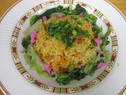 夕食のメニューは五目ごはん・すまし汁・豚肉の生姜焼き・かぼちゃサラダ・チョコムース