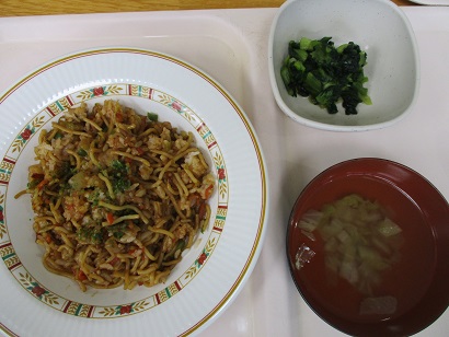 そばめし・コンソメスープ・チンゲン菜生姜和え