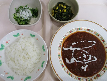 ごはん・ビーフシチュー・ほうれん草ソテー・シーザーサラダ・ケーキ