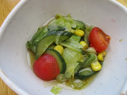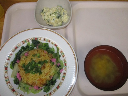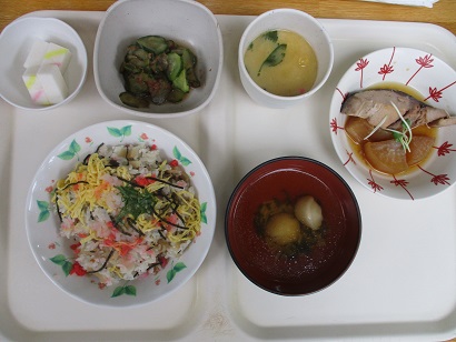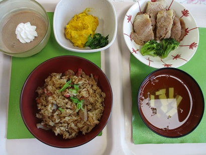 夕食のメニューは五目ごはん・すまし汁・豚肉の生姜焼き・かぼちゃサラダ・チョコムース