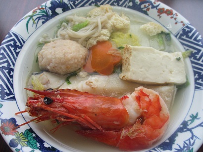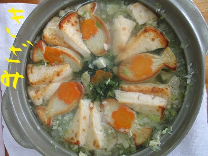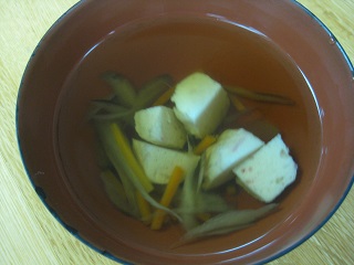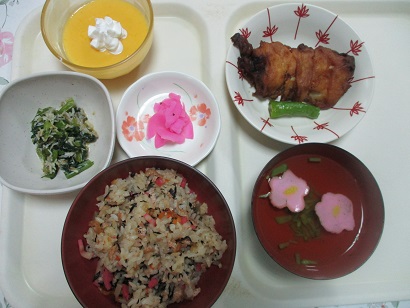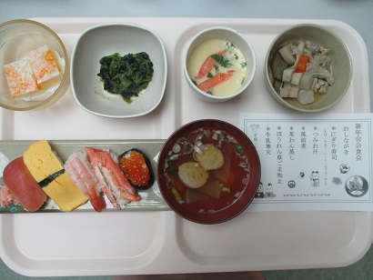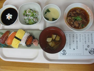 にぎり寿司・つみれ汁・筑前煮・茶わんむし・ほうれん草ごま和え・牛乳寒天