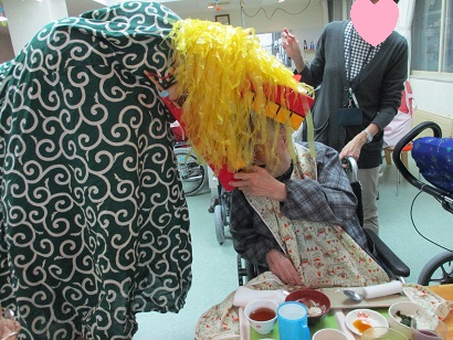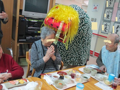 お食事中に音楽が流れてきて、獅子舞の登場です