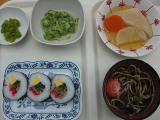 のりまき・そば汁・おでん・きゅうりらっきょう和え・うぐいす豆