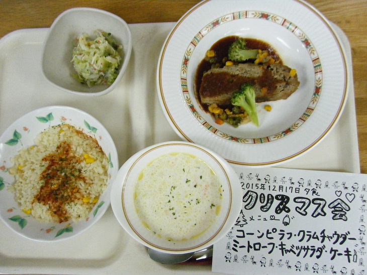 コーンピラフ・クラムチャウダー・ミートローフ・キャベツサラダ・ケーキ