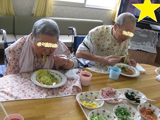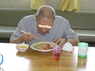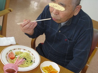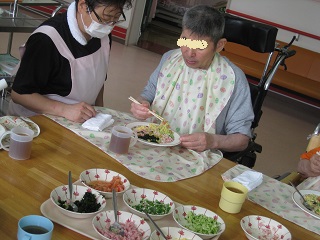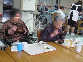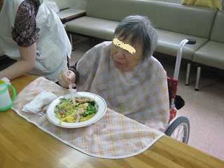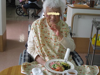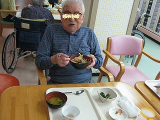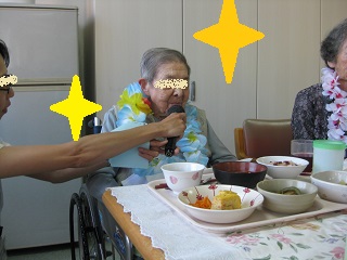 上の写真の左の利用者さまは、いつもお食事を「おいしい」と言って下さっていまして、今日はぜひ調理員さんに感謝の気持ちを伝えたいということでお話しして頂きました