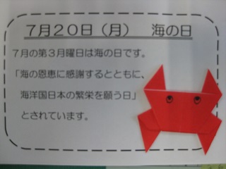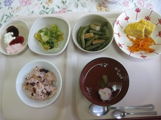 赤飯・すまし汁・かに卵焼き・いんげん含め煮・白菜辛子和え・チョコレートムース