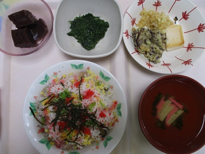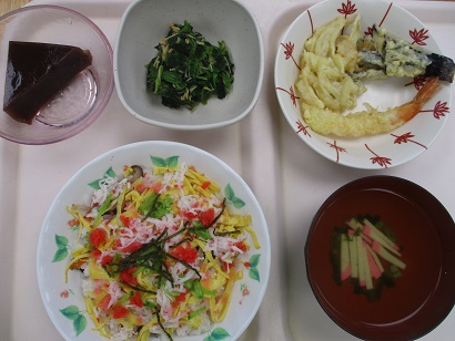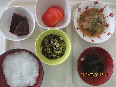 ごはん、すまし汁、山形のだし、鶏肉のおろし煮、冷やしトマト、ようかん