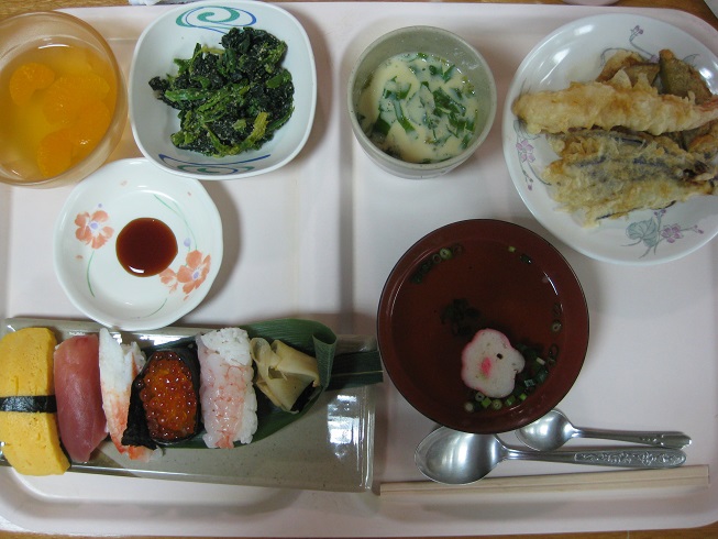 にぎり寿司・すまし汁・天ぷら・茶わん蒸し・ほうれん草のごま和え・みかんゼリー