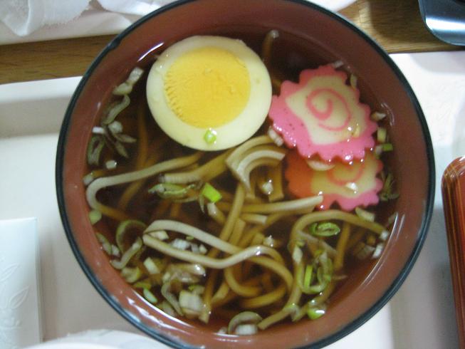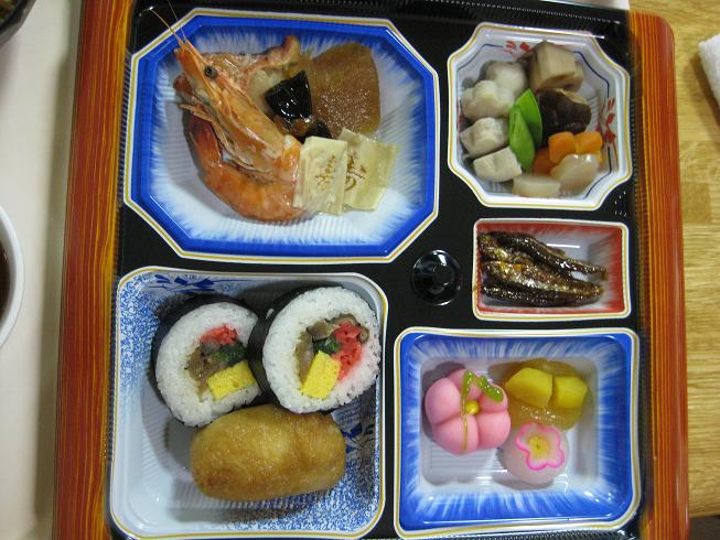 献立は、いなり・のり巻き 年越しそば うま煮 おせち(海老・湯葉・赤魚西京焼き・数の子・にしん昆布巻き・わかさぎの甘露煮) 栗きんとん ねりきり ジュース です。