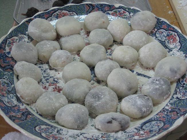 男性陣は搗き手、女性陣はあんこを丸めて準備の真っ最中。